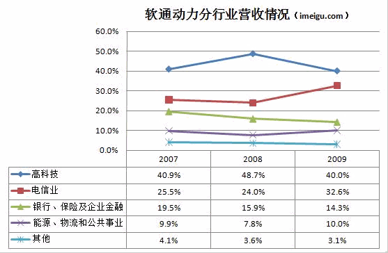 這些行業中,高科技行業占比最大,主要來自微軟、IBM等大型企業集團的軟件分包項目;這些客戶也是軟通動力最賺錢的客戶。2007年、2008年和2009年,來自高新技術產業的收入占軟通動力總收入的40%以上。