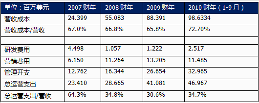 2007年以來,軟通動力的毛利潤逐年增長,從2007年的1029萬美元增加到2009年的4600萬美元;2010年前三季度利潤達到4786萬美元;其毛利率也從2007年的28.2%提高到2009年的34.2%。