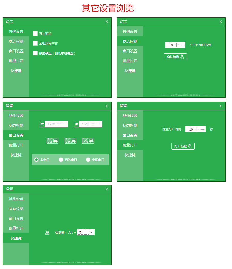 3、為了讓界面更美觀,將分辨率、狀態檢測、批量開啟間隔等統一在“其他設置按鈕”中。