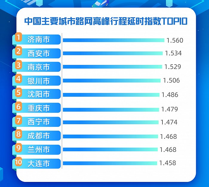 高德交通大數(shù)據(jù)監(jiān)測的50個城市中,2020年一季度中國擁堵延誤指數(shù)最高的十個城市分別是:濟南、西安、南京、銀川、沉陽、重慶、西寧、成都、蘭州、大連。其中,濟南路網高峰出行延誤指數(shù)為1.56,平均時速僅為31.79km/h。